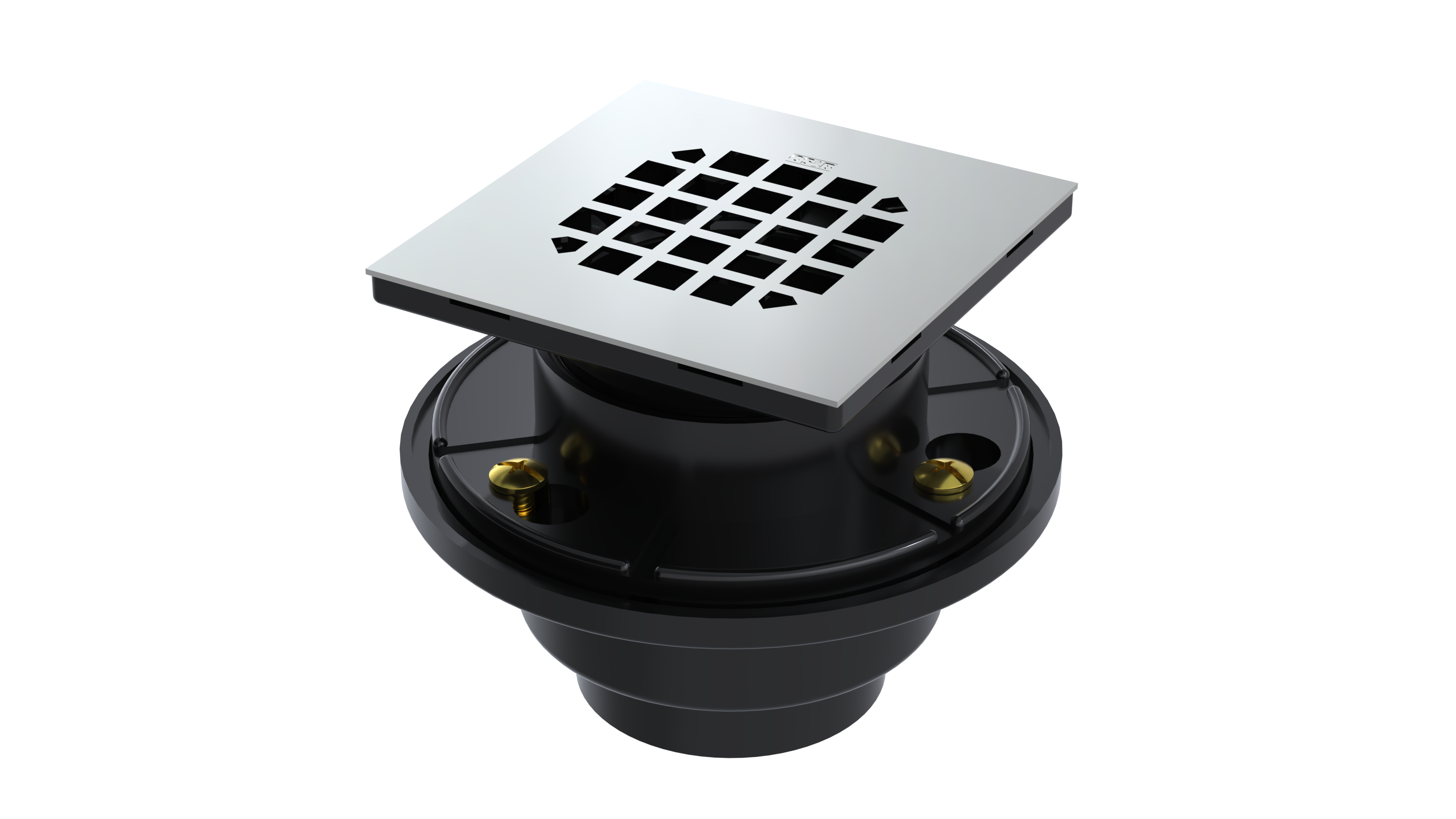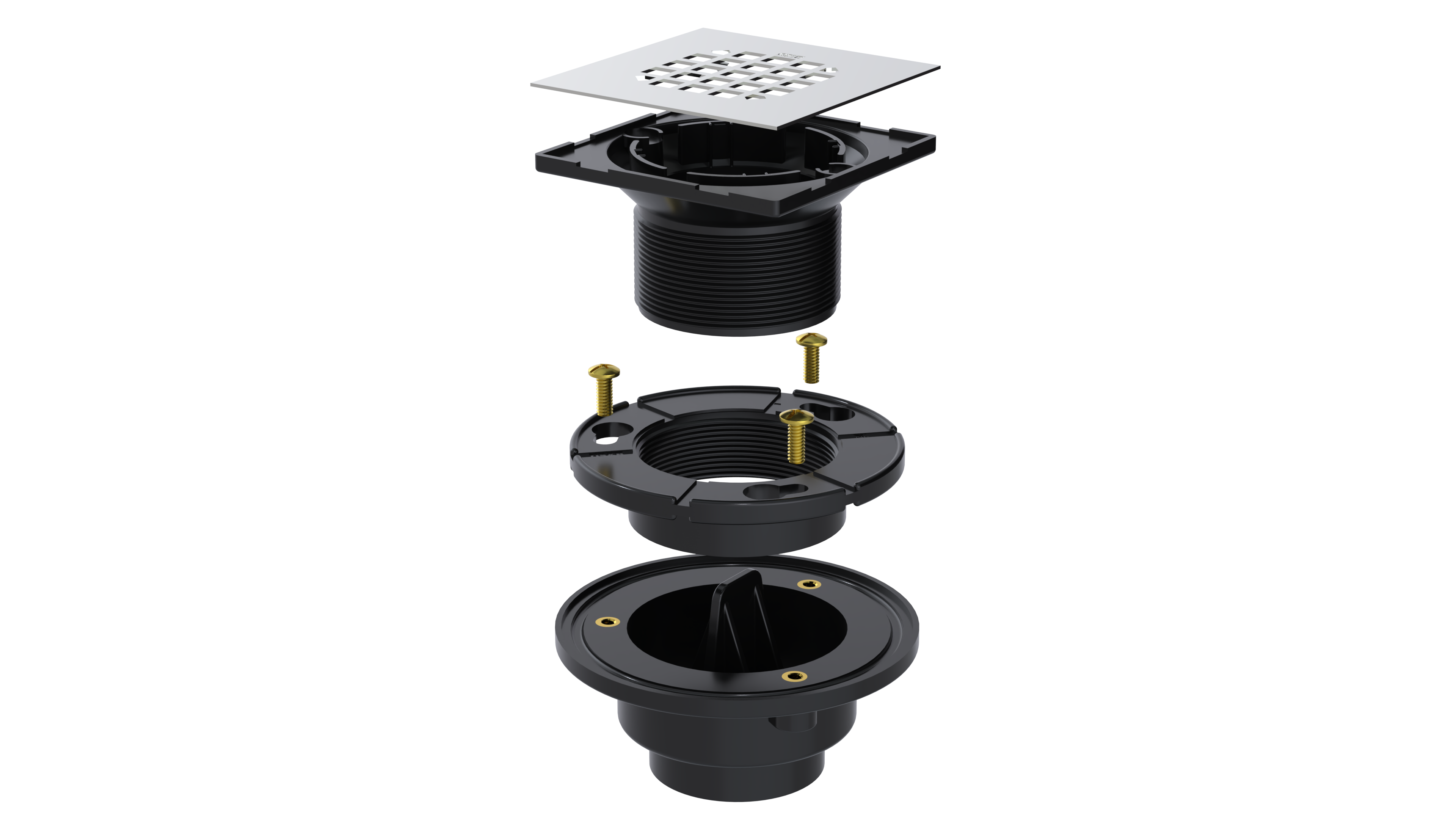 Shower drain shall be 3 piece, 2" ABS outlet with 4-1/4" round screw-in grate. Features a convenient snap-off test cap - now you can air test from below or water test from above.