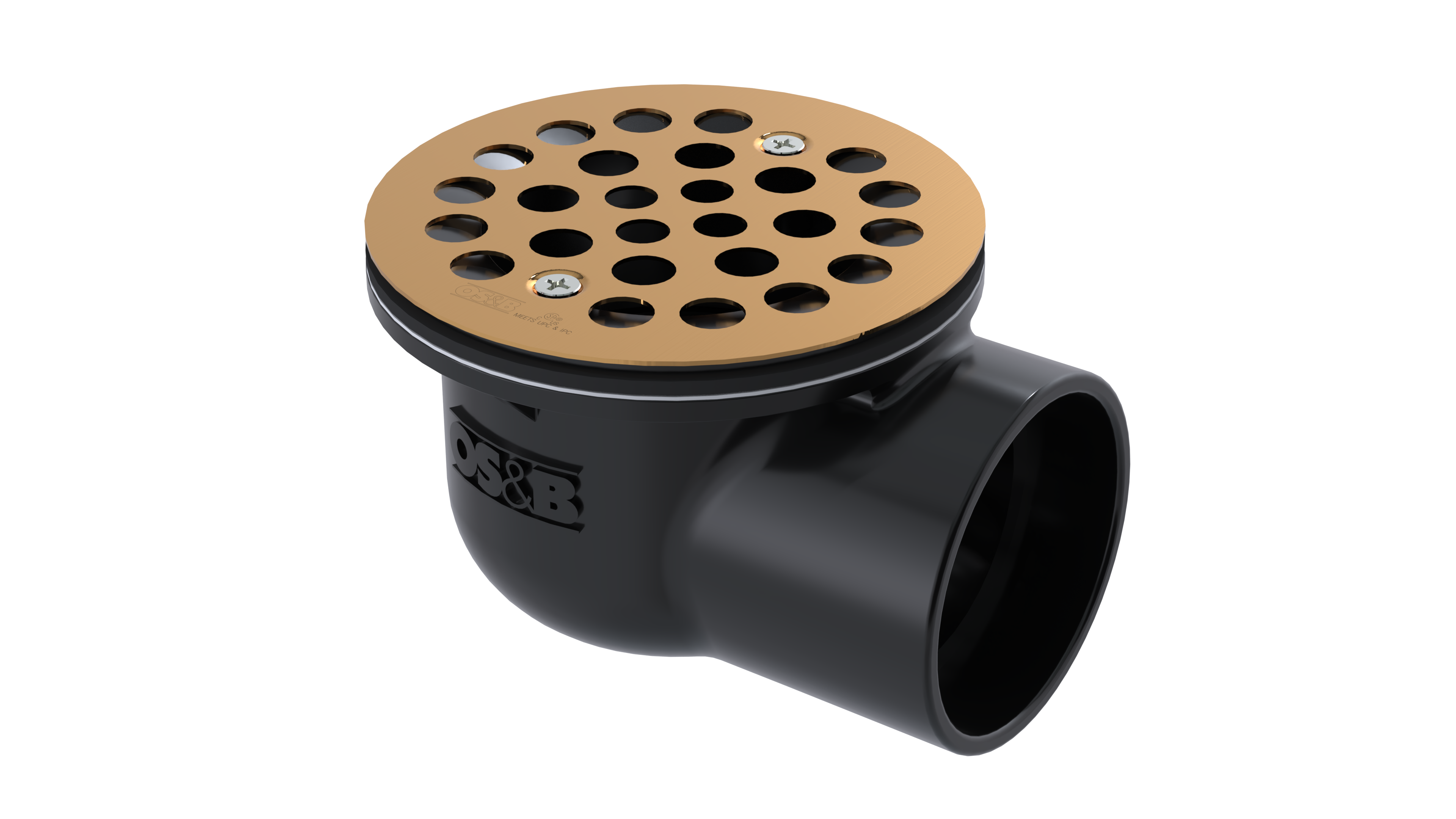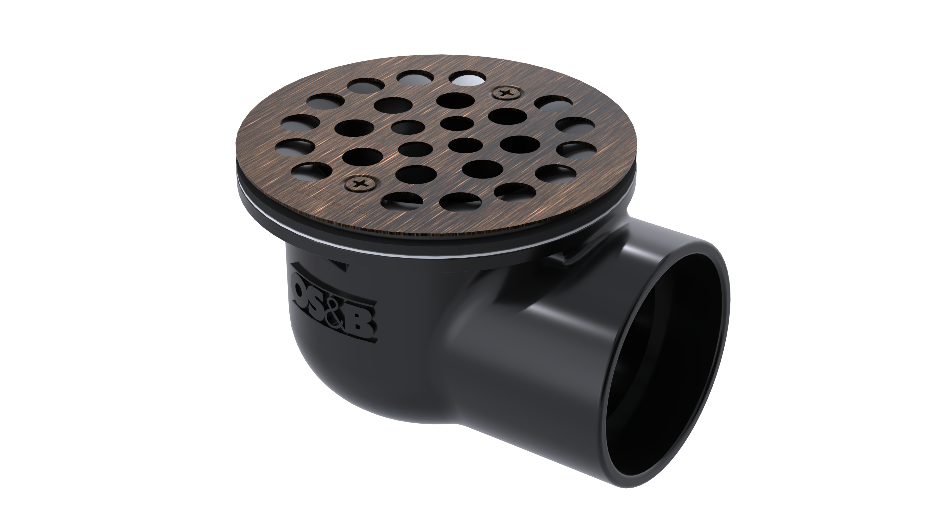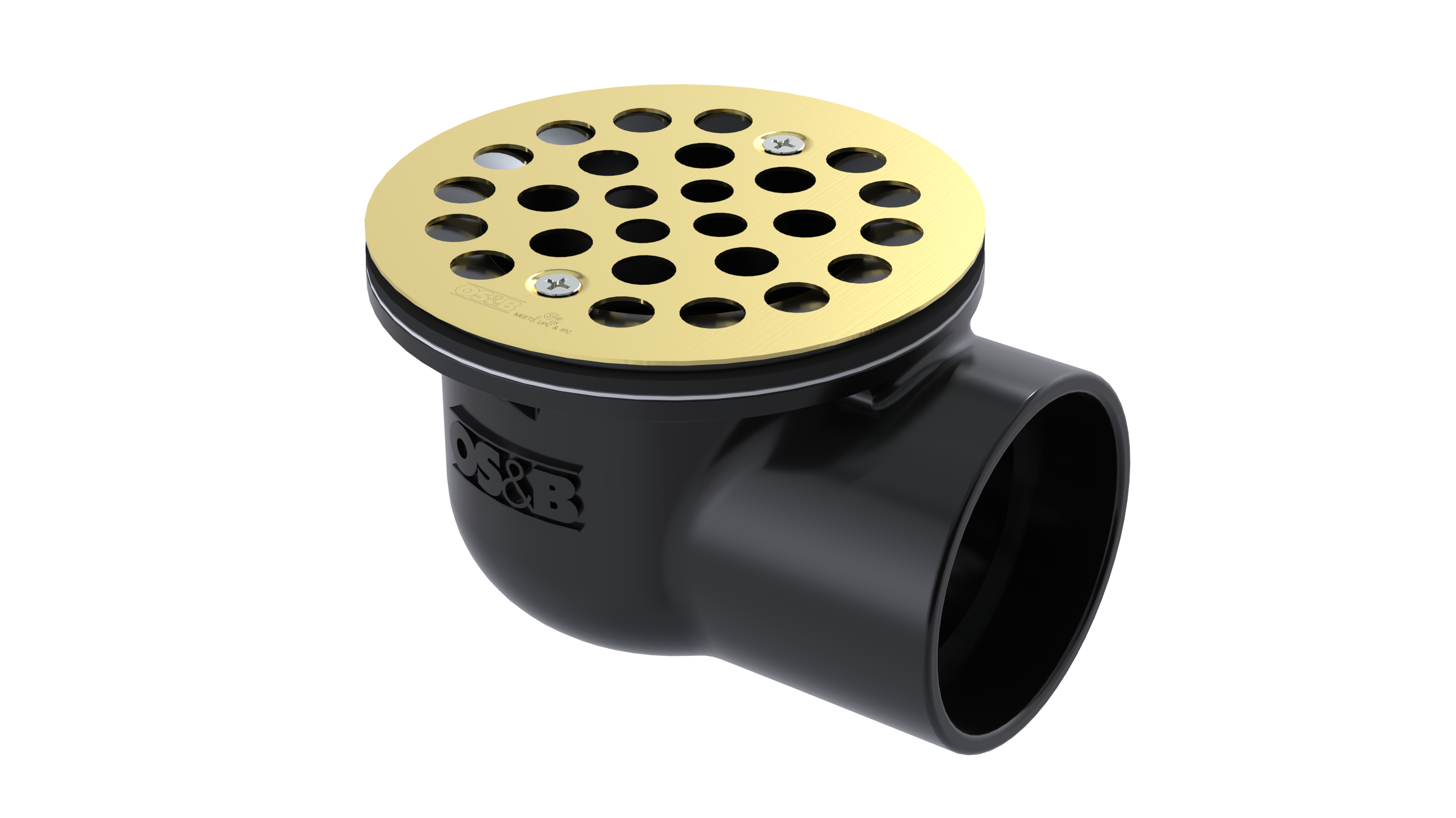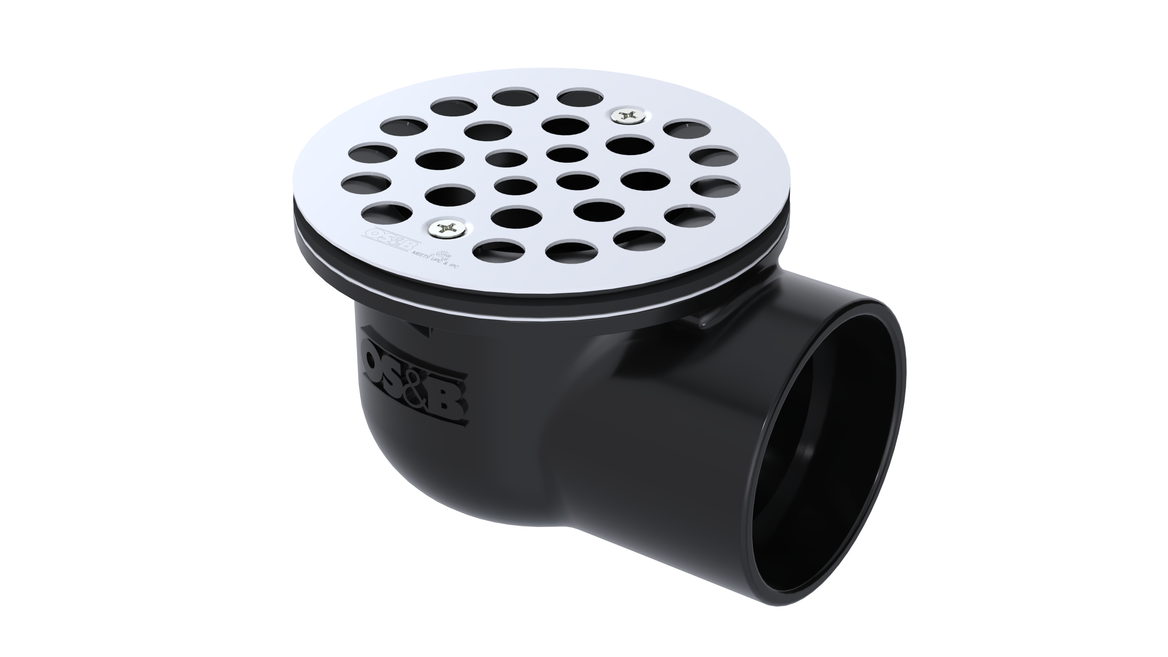 Shower drain shall be 2 piece 2" ABS side discharge outlet round with 2" ABS DWV Hub Connection. 4-1/4" screw-in stainless steel grate. Shower drain for use with molded shower bases. No muss, no fuss, no broken up concrete.