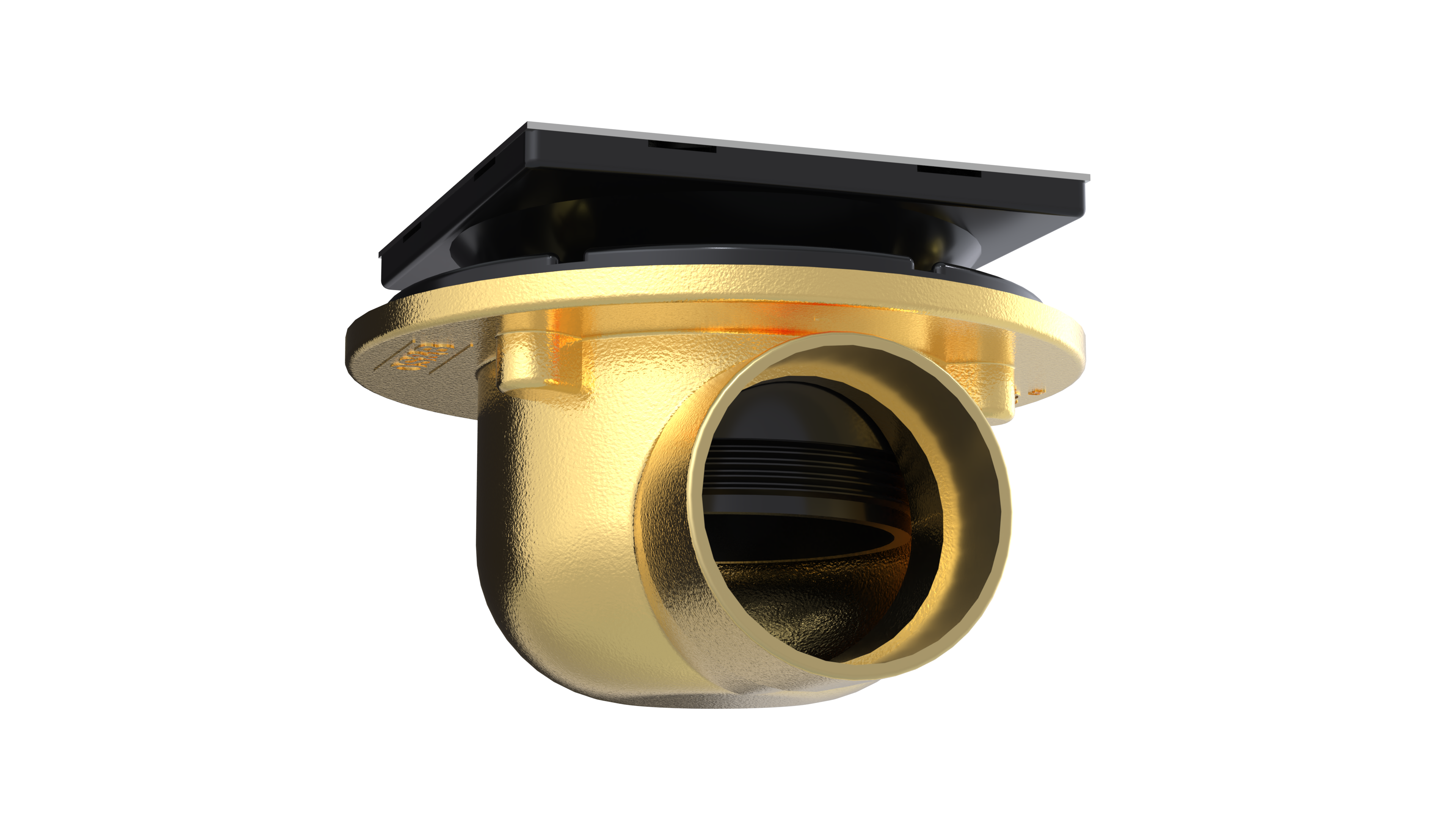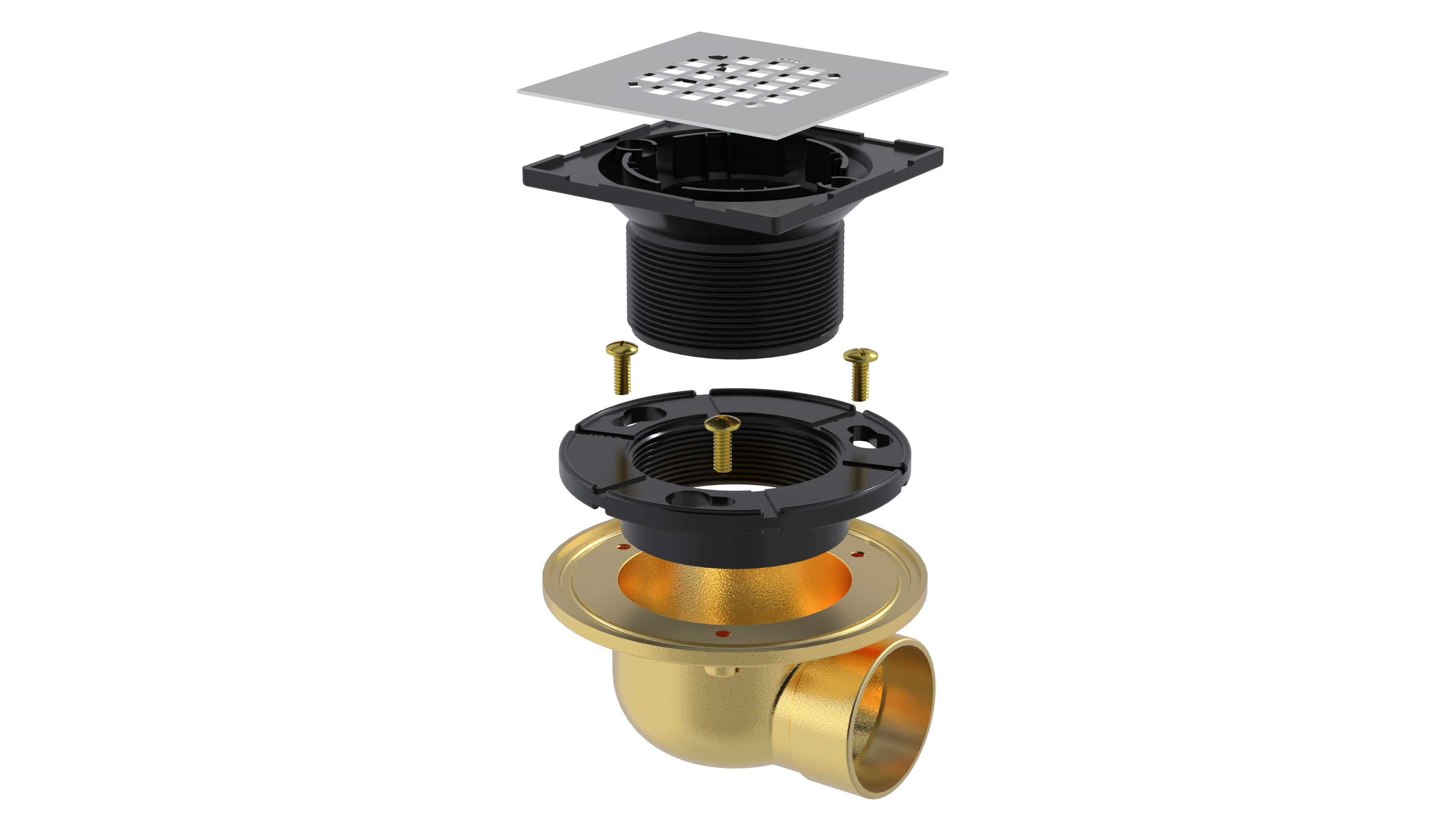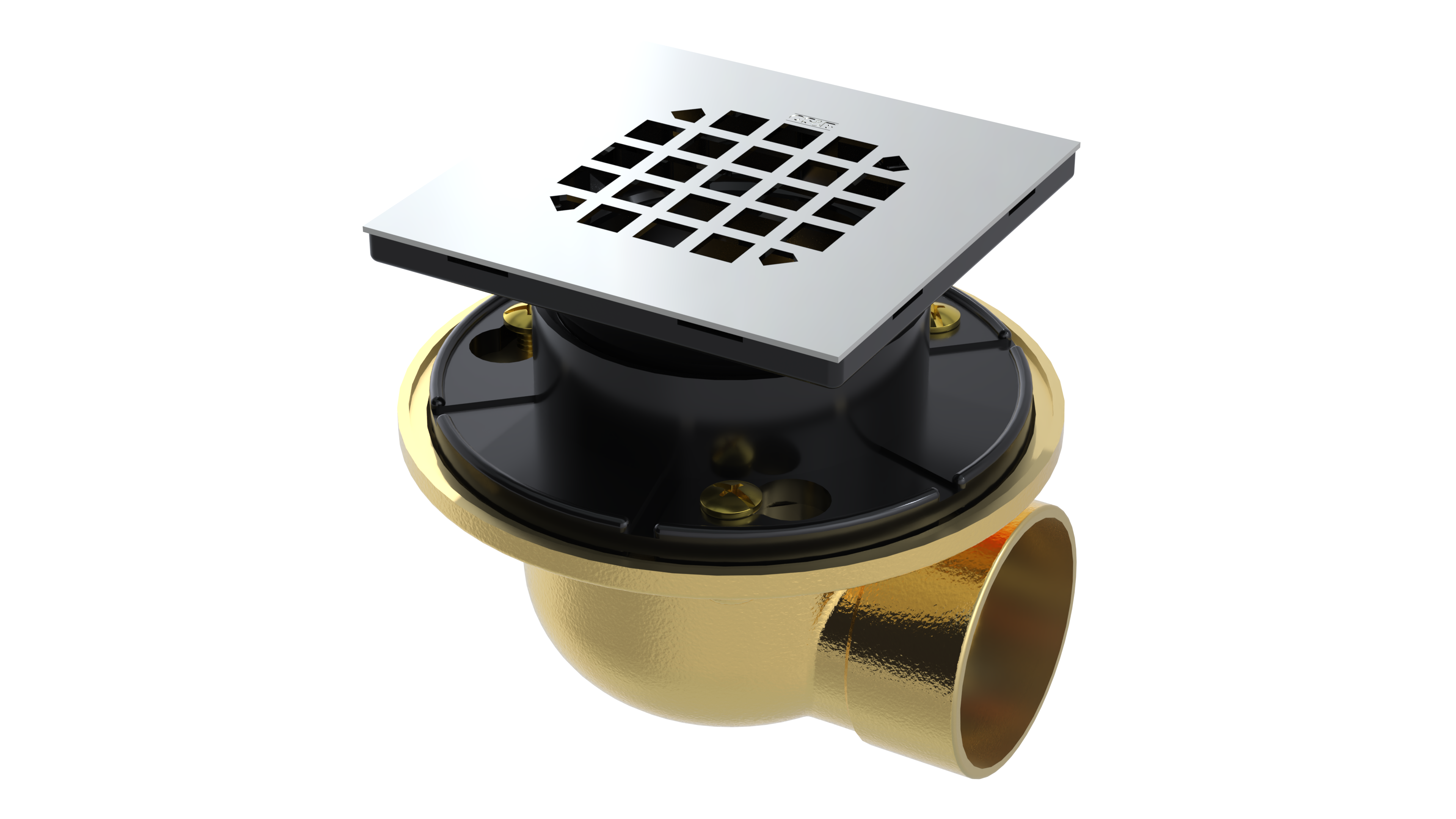 Side discharge shower drain shall be 2" brass (2" copper DWV Hub Connection) for tile shower bases with low profile brass underbody, extra-long ABS thread-in flange and reversible clamping collar.
